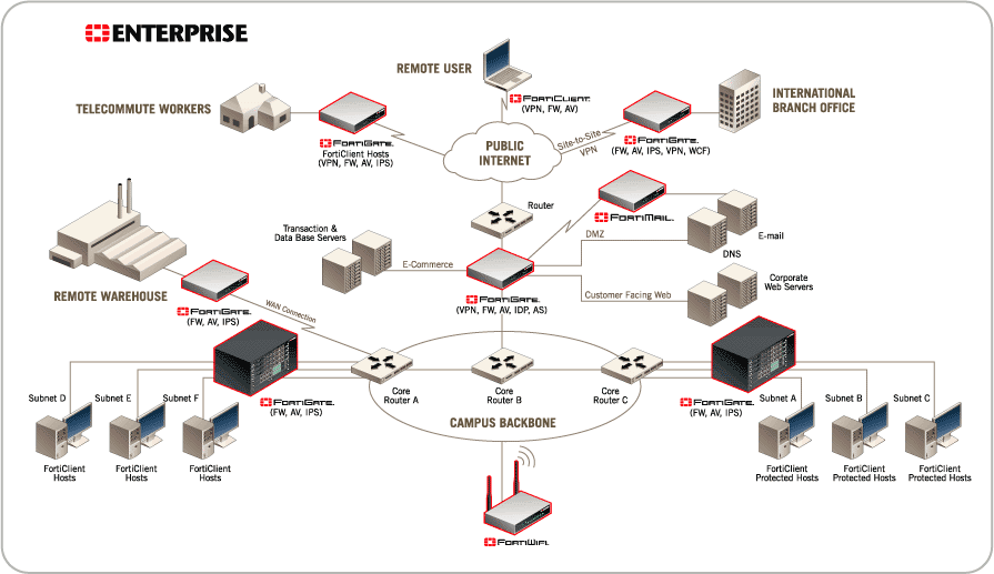 Fortinet tiene una plataforma de seguridad informática de alto rendimiento para estructurar la red en distintos niveles. El sistema operativo de red es lo suficientemente flexible como para implementaciones de todos los tamaños y entornos, desde compañías pequeñas a grandes empresas.