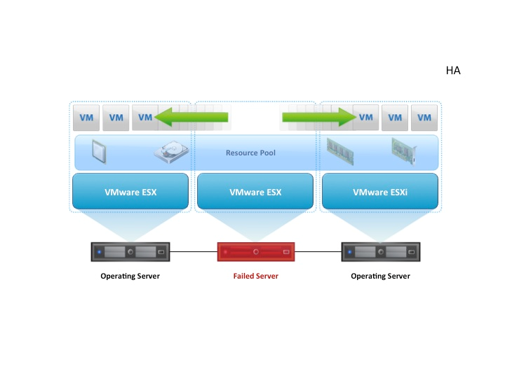 High Availability (HA) proporciona continuidad del negocio rentable para las aplicaciones que se ejecutan en máquinas virtuales. Si un servidor físico falla, las máquinas virtuales afectadas se reinician automáticamente en otros servidores con capacidad disponible. En el caso de que ocurra una falla en el sistema operativo, vSphere HA reinicia la máquina virtual afectada en el mismo servidor físico.